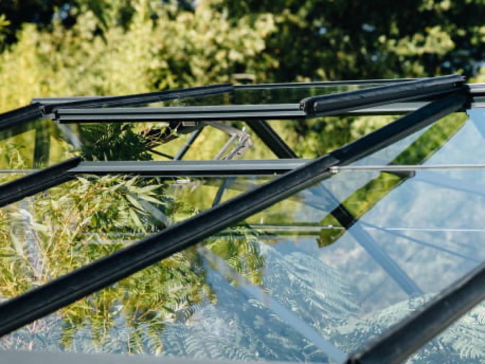 Dzięki przezroczystemu przeszkleniu szklarni promienie słoneczne mogą optymalnie przenikać i utrzymywać ciepło roślin przez cały rok. Ale uwaga: im silniejsze promienie, tym szybciej w szklarni robi się gorąco. W szczycie lata temperatura wewnątrz może osiągnąć nawet 40°C - co nie zawsze jest idealne dla żyjących tam kwiatów i roślin. Aby uniknąć tak wysokich temperatur w szklarni, niezbędna jest dobra cyrkulacja powietrza. Automatyczne otwieranie świetlików zapewnia wentylację przez 24 godziny na dobę, bez konieczności przebywania na miejscu.